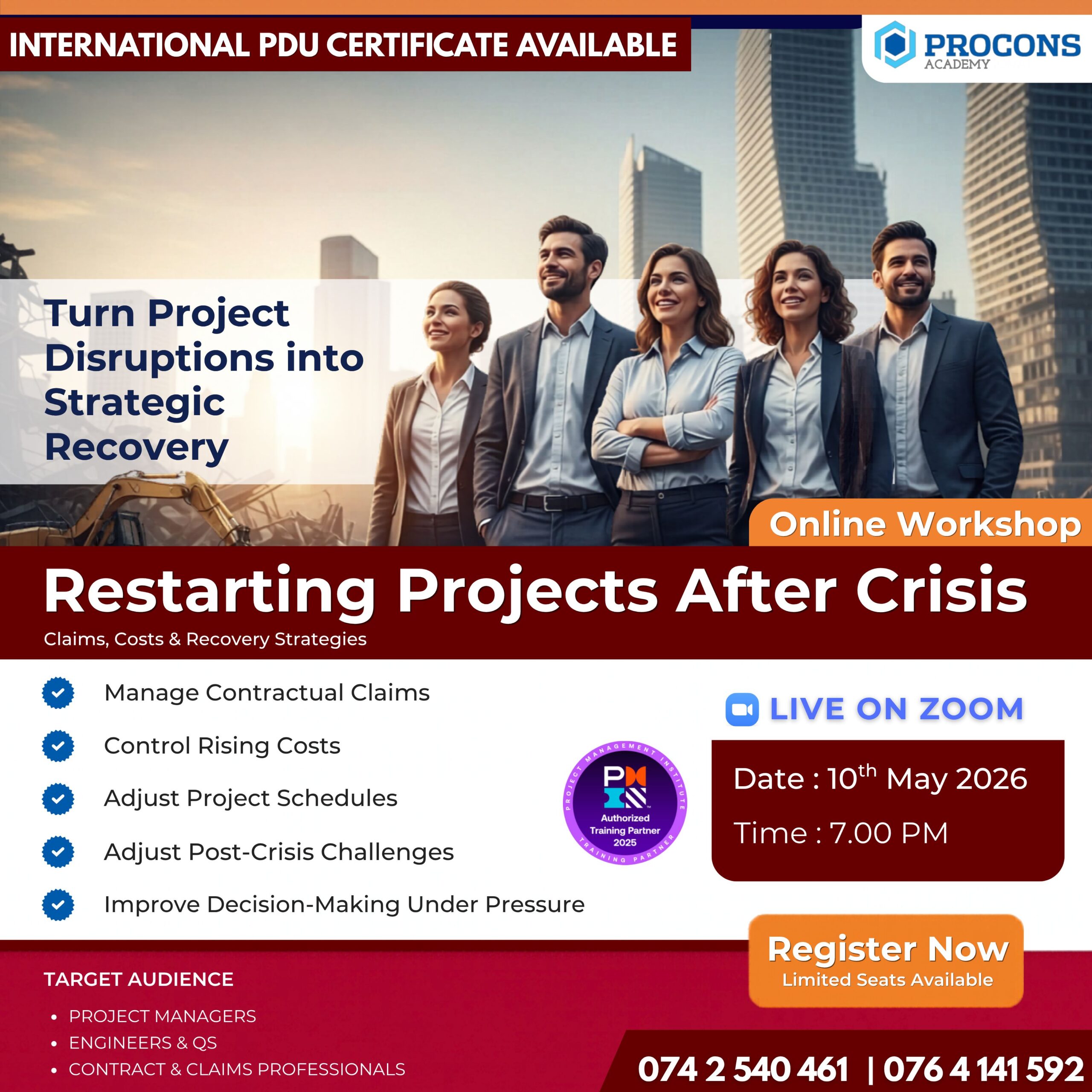 This 03 hour workshop provides project professionals with practical guidance on effectively restarting projects following a crisis or disruption. The session focuses on managing project recovery by addressing key areas such as contractual claims, cost impacts, schedule adjustments, and stakeholder alignment.